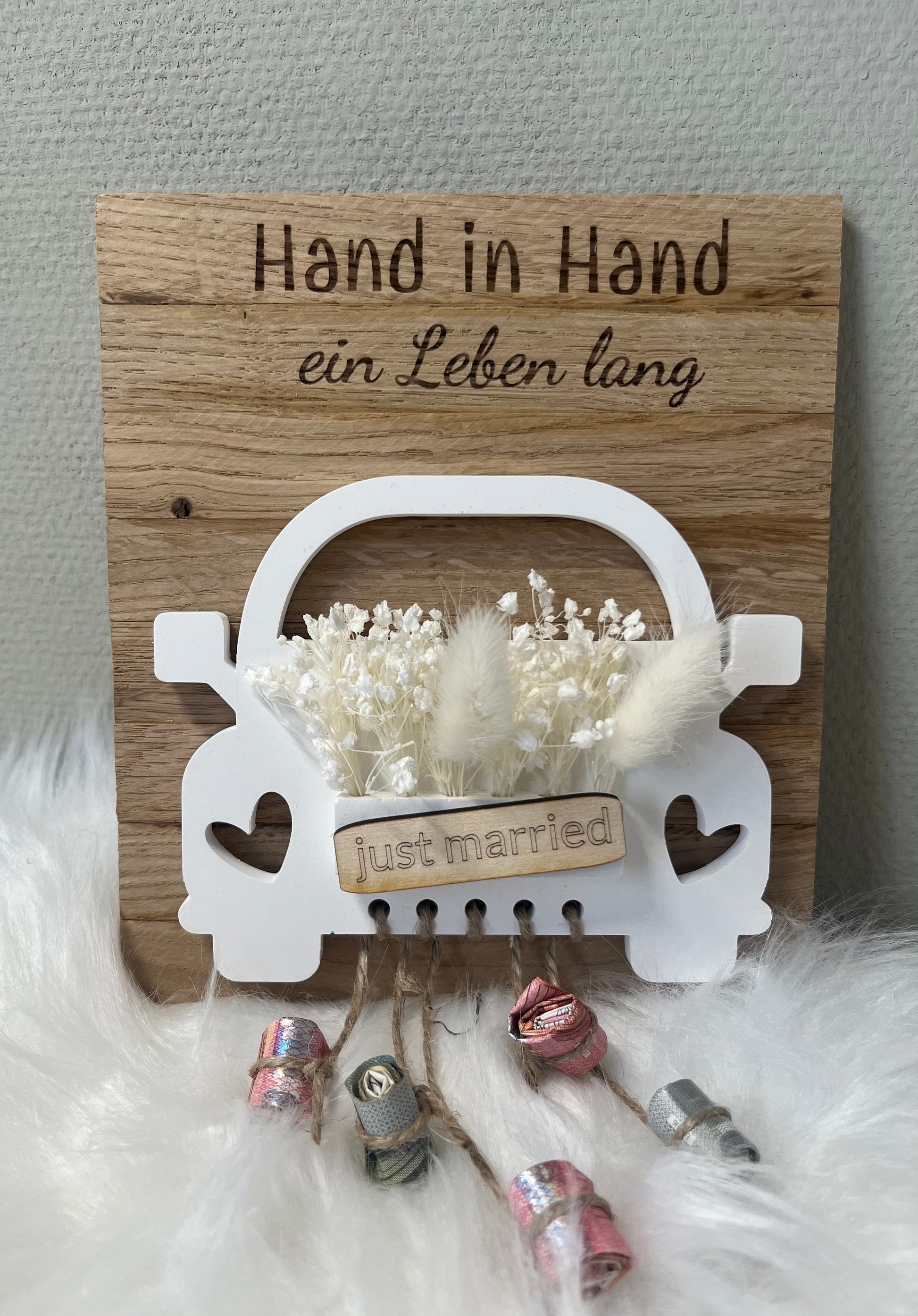 Ich biete euch hier ein wunderschönes Geschenk zur Hochzeit an. Das Geschenk ist eine wundervolle Alternative wenn man zur Hochzeit Geld überreichen möchte, und nicht nur eine Karte in der Hand haben möchte. Zu Euch kommt ein gegossenes Auto auf einem kleinen Holzbrett. Auf dem Holzbrett sind liebevoll die Worte: Hand in Hand ein Leben lang eingelasert. Das Auto selbst ist mit vielen Blumen verziert und hat am unteren Ende 5 Stricke. An diesen kann das Geld befestigt werden, zum Beispiel gerollt - so sieht es aus als hängen lauter Dosen am Auto. ♥️👩❤️💋👨