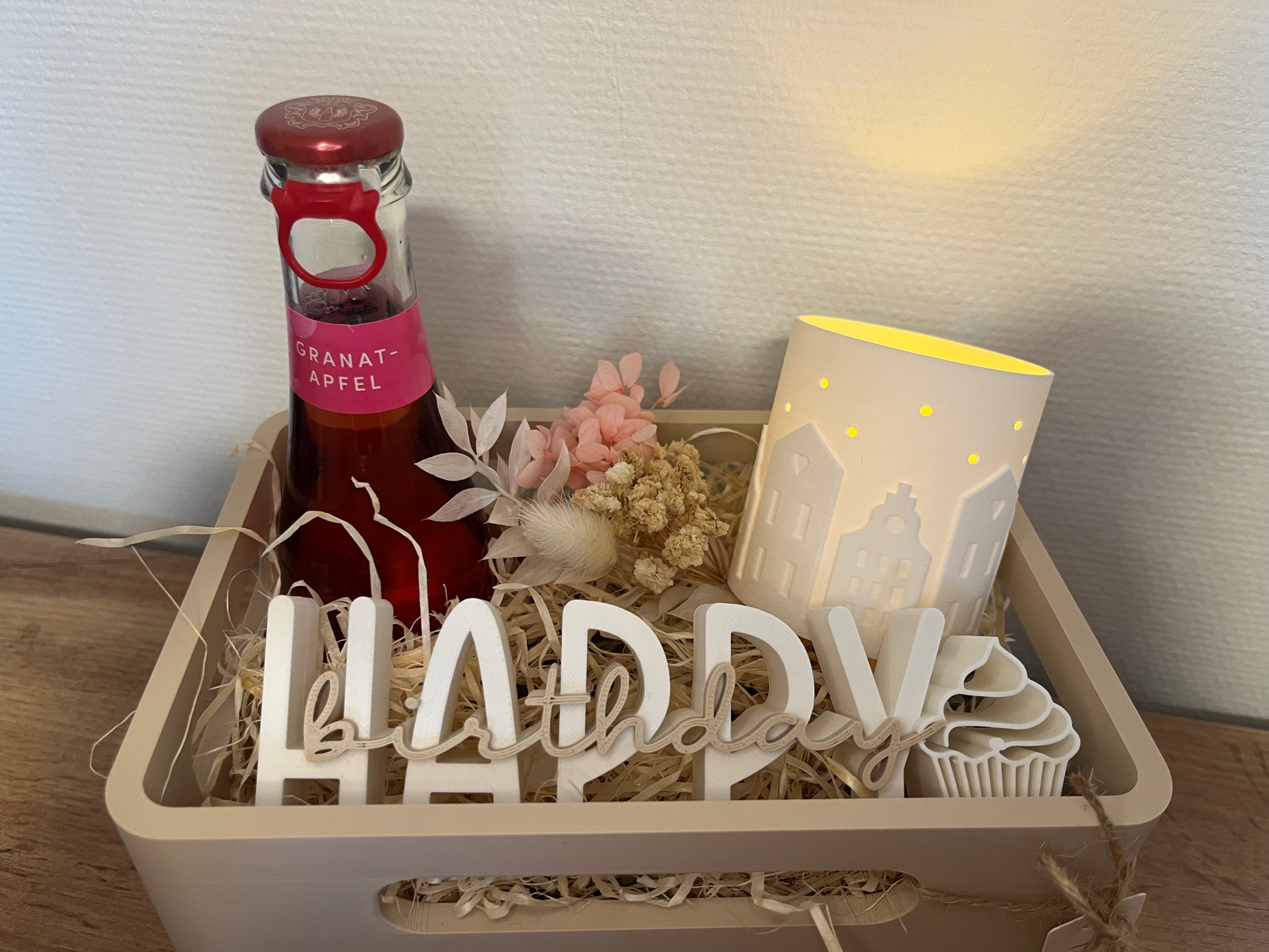 Ich verkaufe hier ein wunderschönes Geburtstagsset bestehend aus einem kleinen Kasten, einem „Happy Birthday“ Schriftzug und einem kleinem Teelichthalter inklusive LED-Teelicht. Der Kasten ist bereits mit Holzwolle gefüllt wenn er zu euch kommt. Ebenfalls enthalten ist ein kleiner Trockenblumenstrauß zur Dekoration. Alle Produkte sind aus PLA im 3D Drucker gefertigt. 🎁