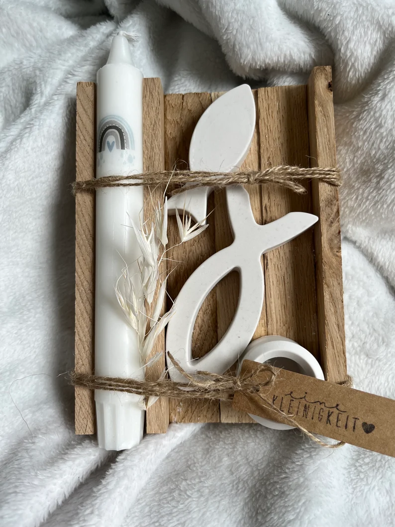 Ein Set passend für die Taufe oder die Konfirmation! 🤍 Das Set besteht aus einer Kerze mit Regenbogen in der Farbe eurer Wahl, passendem Kerzenhalter sowie 2 Fischen. Verpackt kommt alles in einem kleinen Holzkästchen, wie auf dem Foto zu sehen.