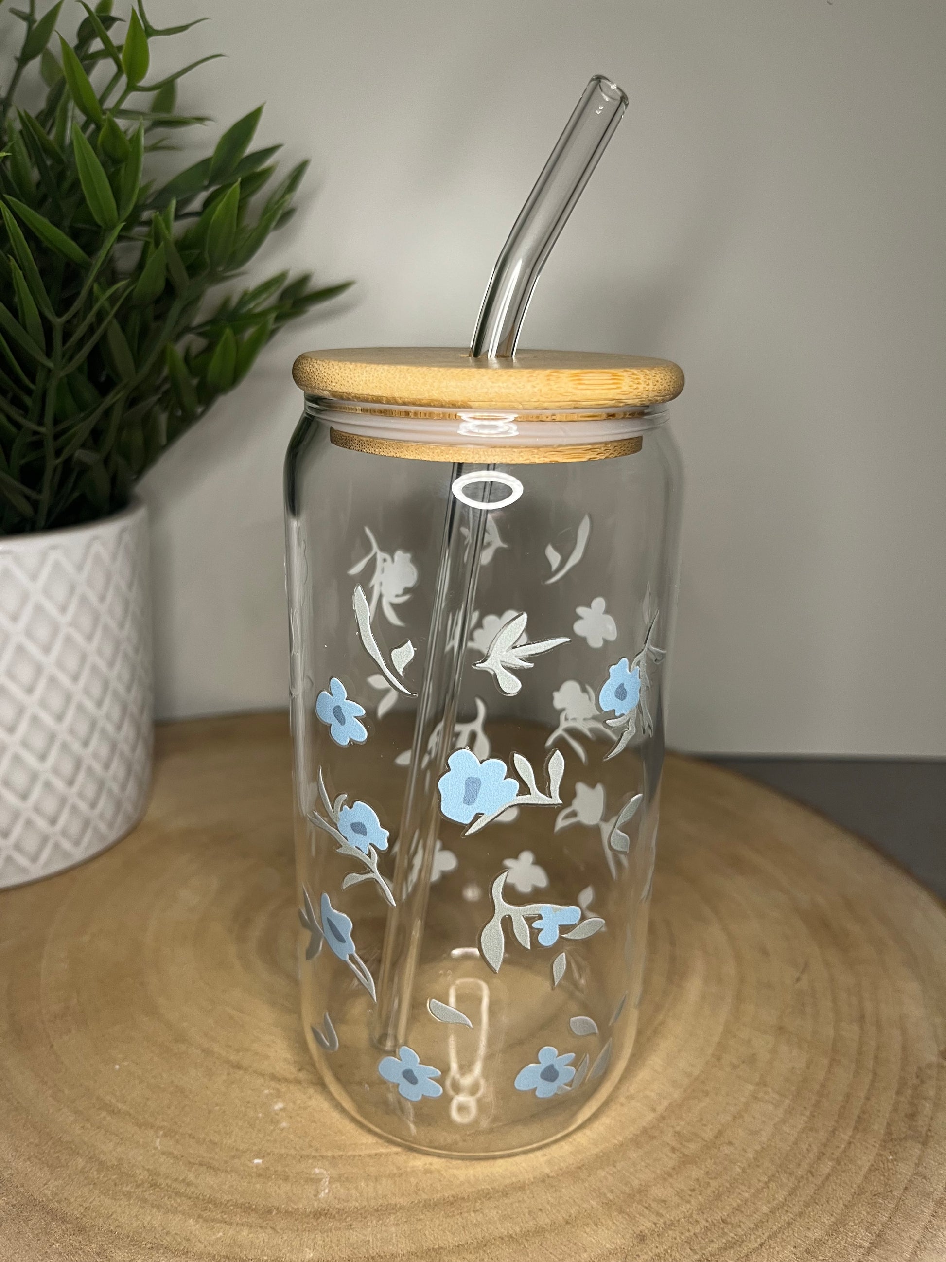 Trinkbecher aus Glas im blauen Blumendesign. Durch den Deckel samt Strohhalm ist das Glas besonders für den Sommer sehr praktisch. Das Glas fast ca. 450ml.