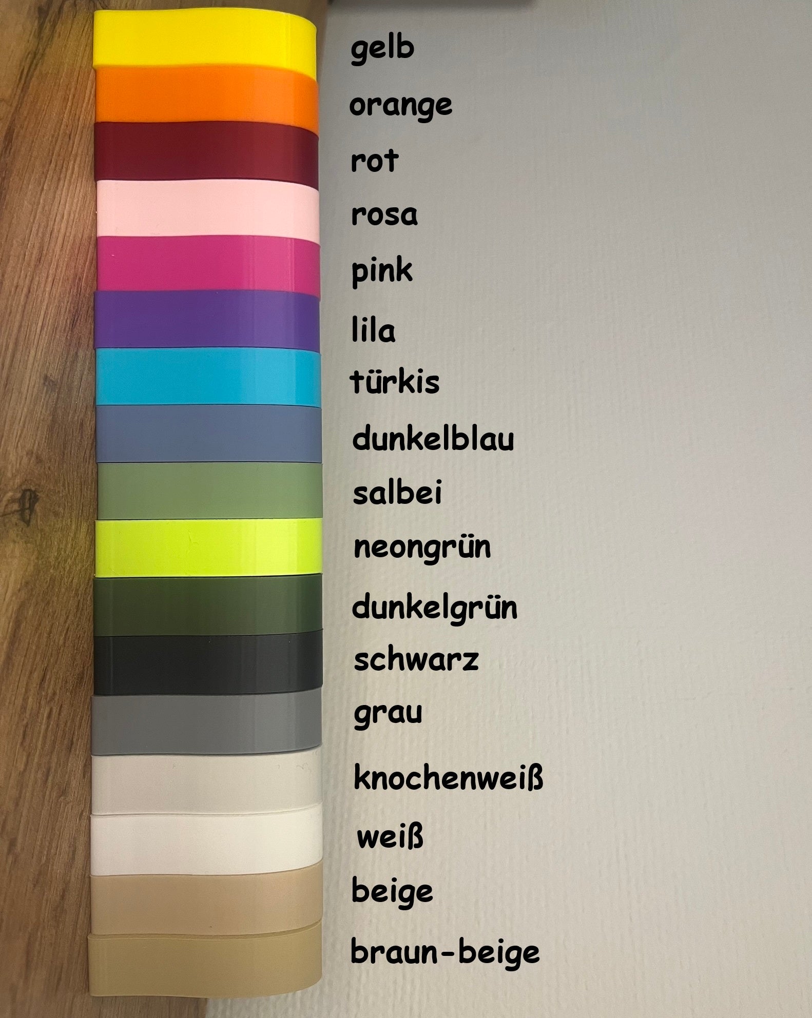 Schriftzug „schön hier“. Ihr bekommt hier einen knalligen Statement Schriftzug in den Farben eurer Wahl. Der Schriftzug entsteht im 3D-Drucker und ist aus umweltfreundlichen PLA. Ihr könnt jeweils auswählen zwischen der Basisfarbe (im Beispiel gelb) und der Zweitfarbe (im Beispiel rosa). Eine Übersicht aller Farben findet ihr im Bild 2.