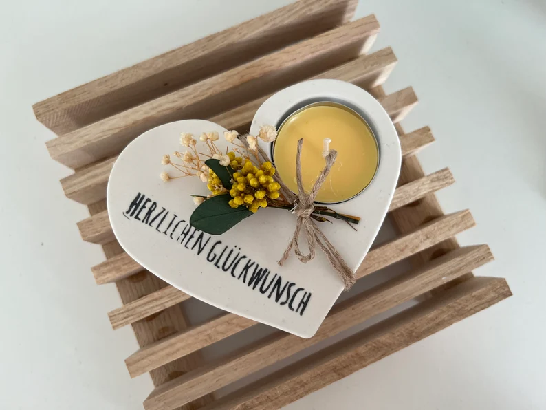 Teelichtherz als Geburtstagsgeschenk. Das Herz dient als Teelichthalter und ist liebevoll mit Kerze und Blumensträußchen verziert. Bestempelt ist es mit der Schrift "Herzlichen Glückwunsch".