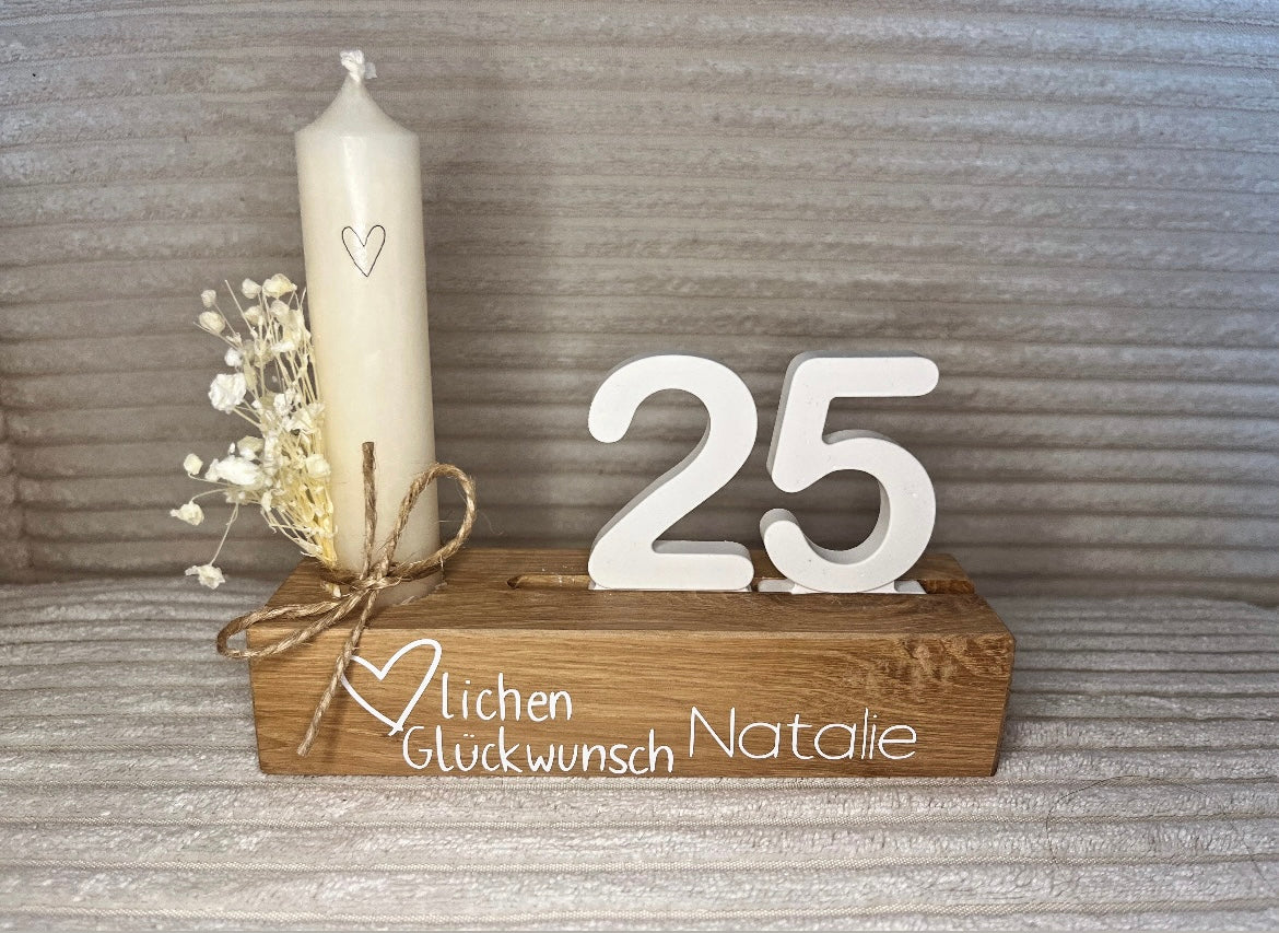 Ich biete euch hier ein wunderschönes Geschenk zum Geburtstag an. Der Kerzenhalter ist Handarbeit und aus Eichenholz, so bildet er einen wunderschönen Kontrast zu den Zahleneinschiebern in weiß. Gern kann der Kerzenhalter, je nach Geschmack mit oder ohne Personalisierung bestellt werden. Je nach länge der Namen kann die Schriftart auf dem Kerzenhalter variieren. Zu jedem Set können zwei Zahlen gewählt werden. ♥️