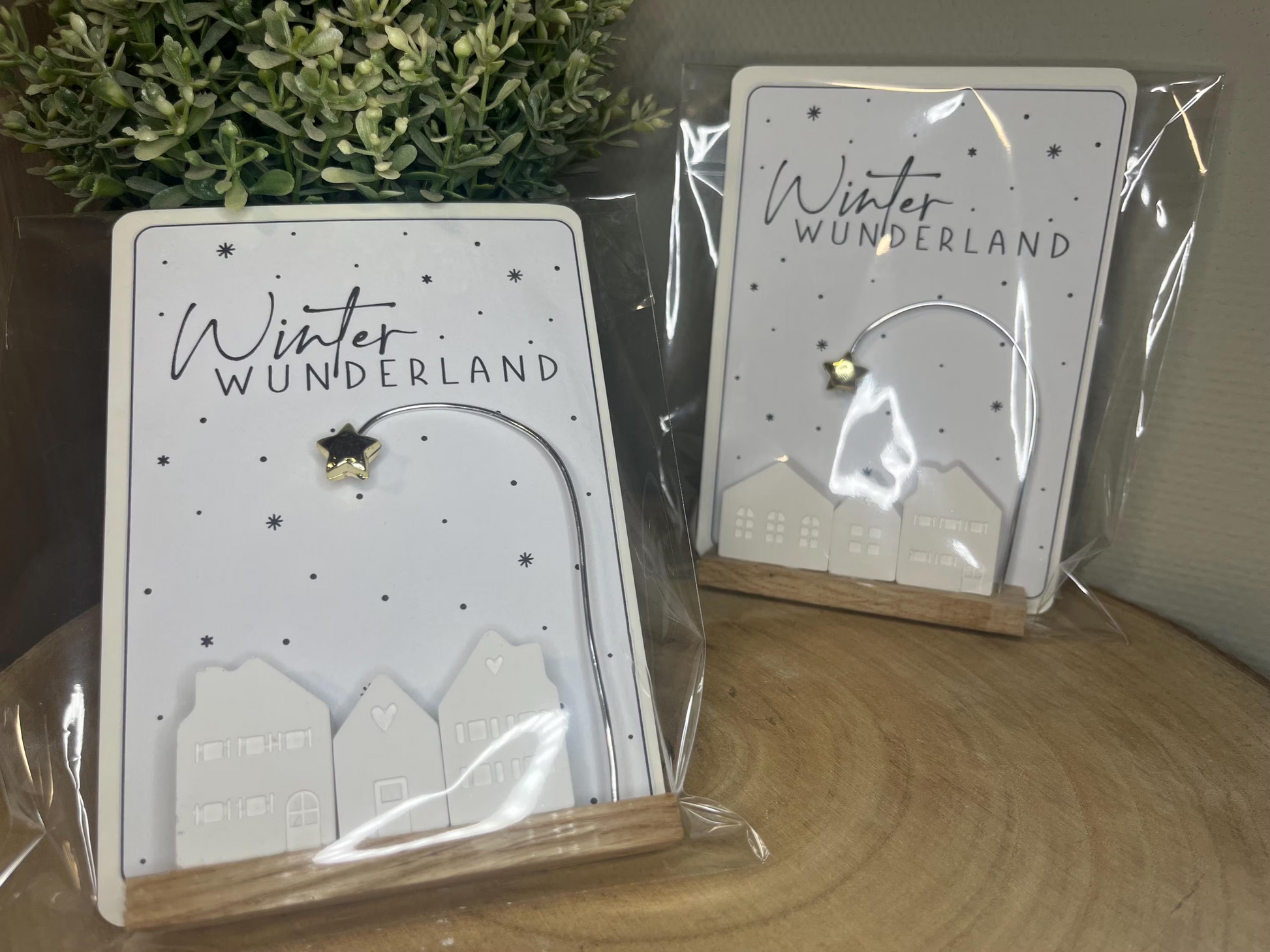Kleines Mitbringsel oder Geschenk in der Winter - und Weihnachtszeit. „Winterwunderland“ auf Holzsockel platzierte Häuser unter einem Stern. Die Häuser variieren wie auf dem Foto zu sehen. 🩶